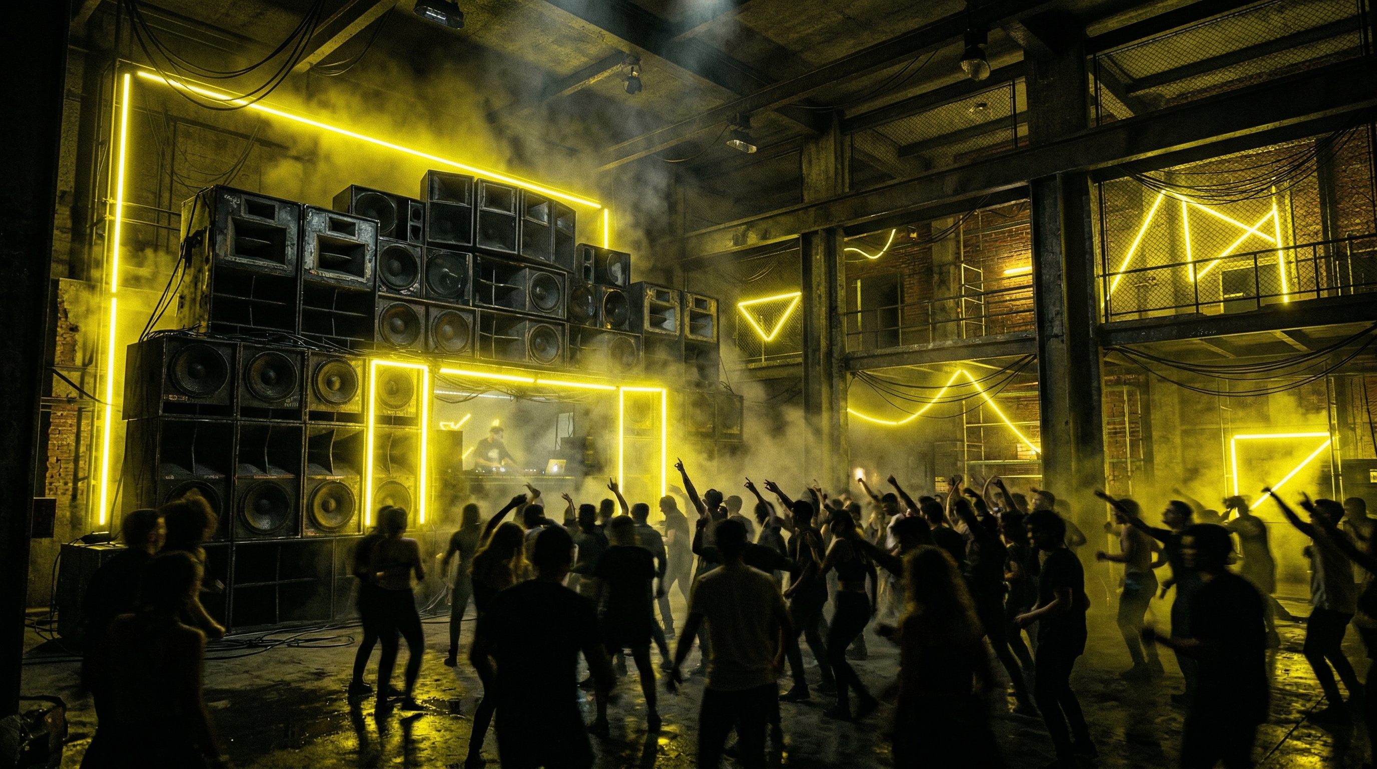 Dark warehouse, neon yellow accents, industrial, gritty. Speaker stacks, smoke machines, strobes.